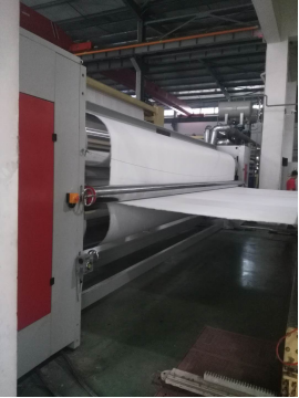 熱軋工序的主要目的是使被刺針從布卷中鉤出的纖維,由直立狀態(tài)經燙平全熨伏在卷材表面上,從而改善了土工布的表面光滑度。另外,其中的化學纖維受熱后會軟化并微熔,進一步提高了土工布的剝離強度。